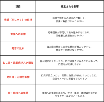 出っ歯だからといって治療が必須、というわけではありませんが、次のような影響が出やすいため、「見た目以外の理由」でも早めに対処を考える方が安全です。