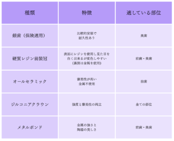 差し歯に使われる人工歯(クラウン)は素材によっていくつか種類があります。